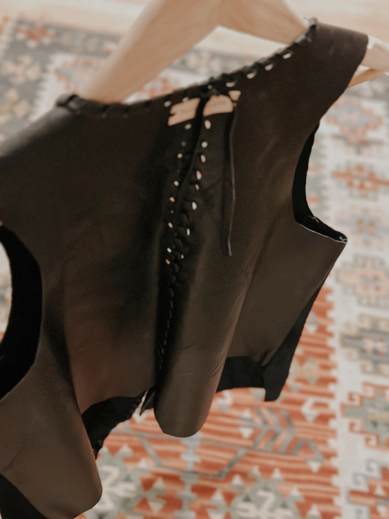 Detalles: la espalda es más corta, perfecta para combinar con pantalones de tiro alto o vestidos. Todo su contorno está cosido en gamuza, con las marcas propias de la costura a mano.